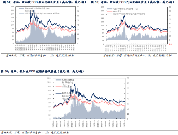 东南亚市场:截至2025年10月24日当周,新加坡柴油、汽油、航煤周均价分别为85.76(+0.08)、75.55(-0.23)、85.21(+0.23)美元/桶;与原油差价分别为23.74(+0.43)、13.21(-0.19)、23.11(+0.50)美元/桶。