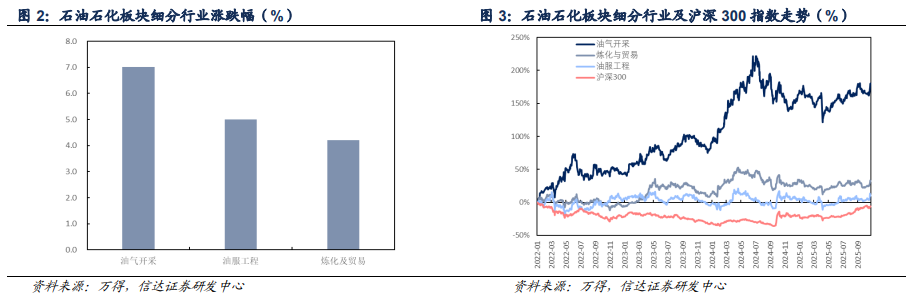 截至2025年10月24日当周,油气开采板块自2022年以来涨幅180.52%,炼化及贸易板块自2022年以来涨幅31.50%,油服工程板块自2022年以来涨幅10.03%。