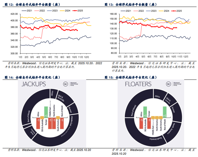 已有合同的钻井平台数量:截至2025年10月20日当周,全球海上自升式钻井平台数量为370座,较上周减少3座,其中非洲、中东、北美、其他地区各减少1座,欧洲增加1座;全球海上浮式钻井平台数量为132座,较上周持平,其中非洲、欧洲各减少1座,东南亚、其他地区各增加1座。