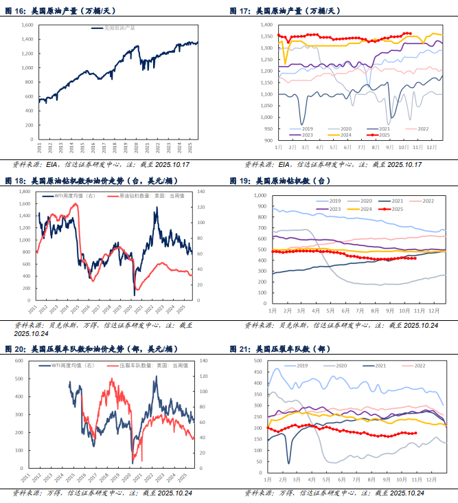 【美国原油供给】截至2025年10月17日当周,美国原油产量为1362.9万桶/天,较上周减少0.7万桶/天。截至2025年10月24日当周,美国活跃钻机数量为420台,较上周增加2台。截至2025年10月24日当周,美国压裂车队数量为178部,较上周增加3部。