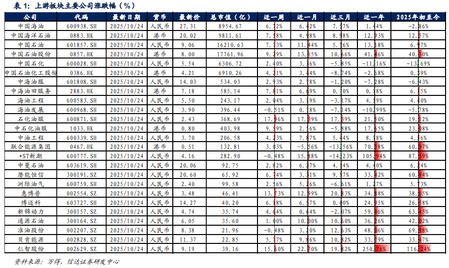 截至2025年10月24日当周,上游板块股价表现较好的是石化油服(+17.96%)、仁智股份(维权)(+15.60%)、惠博普(+13.73%)。