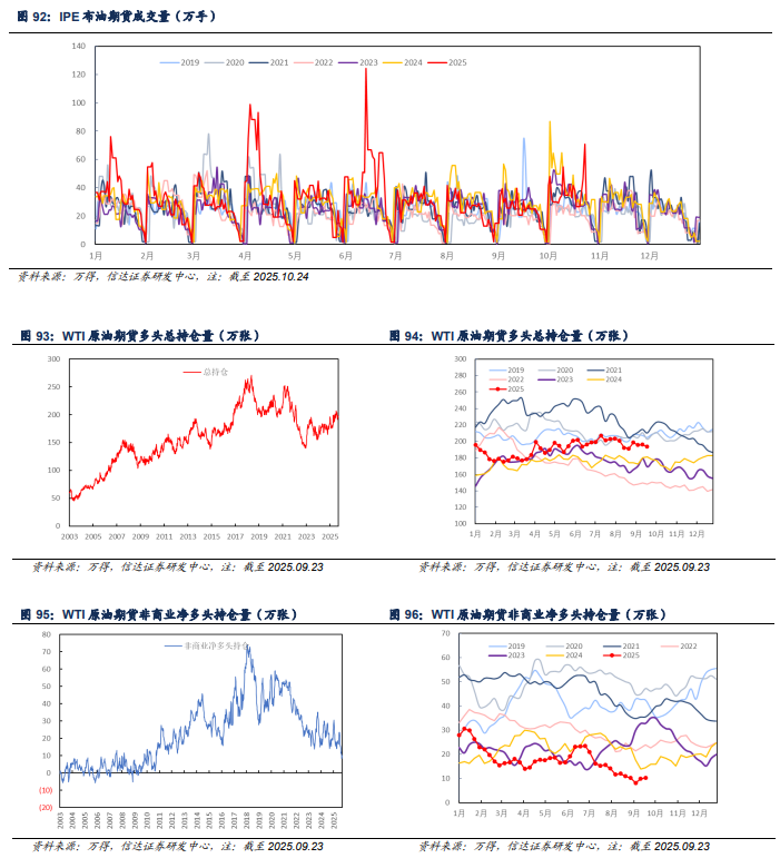 原油期货成交及持仓:截至2025年10月24日,周内布伦特原油期货成交量为265.76万手,较上周增加6.82万手(+2.63%)。截止至2025年09月23日,周内WTI原油期货多头总持仓量为193.67万张,较上周减少2.59万张(-1.32%);非商业(投机和套利目的持有)净多头持仓10.3万张,较上周增加0.42万张(+4.30%)。