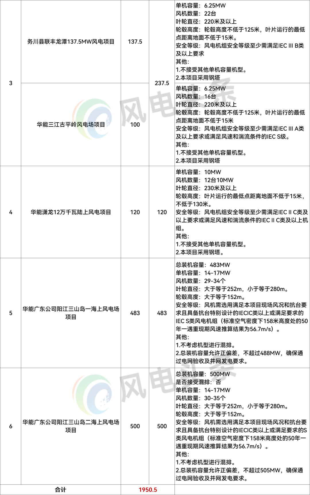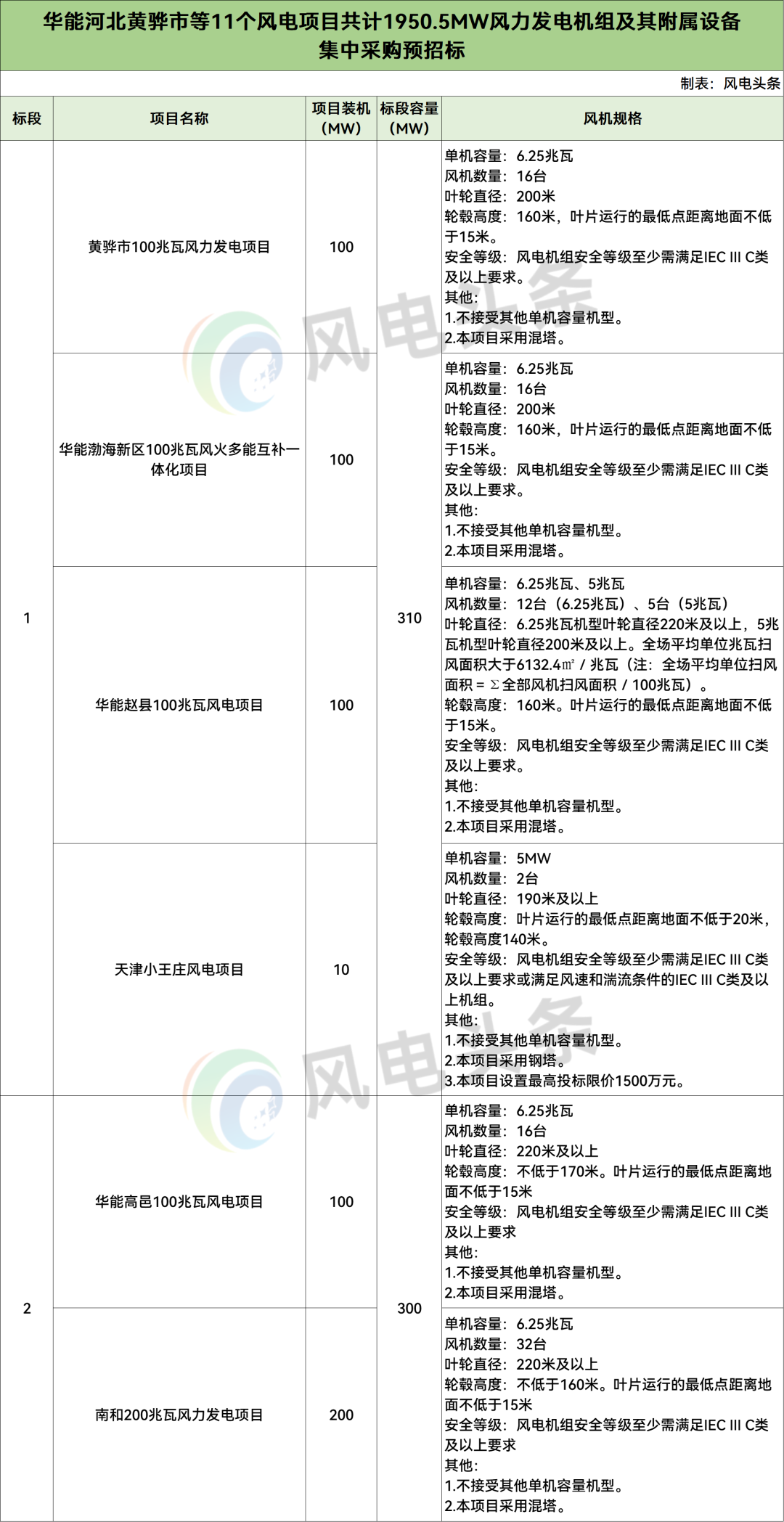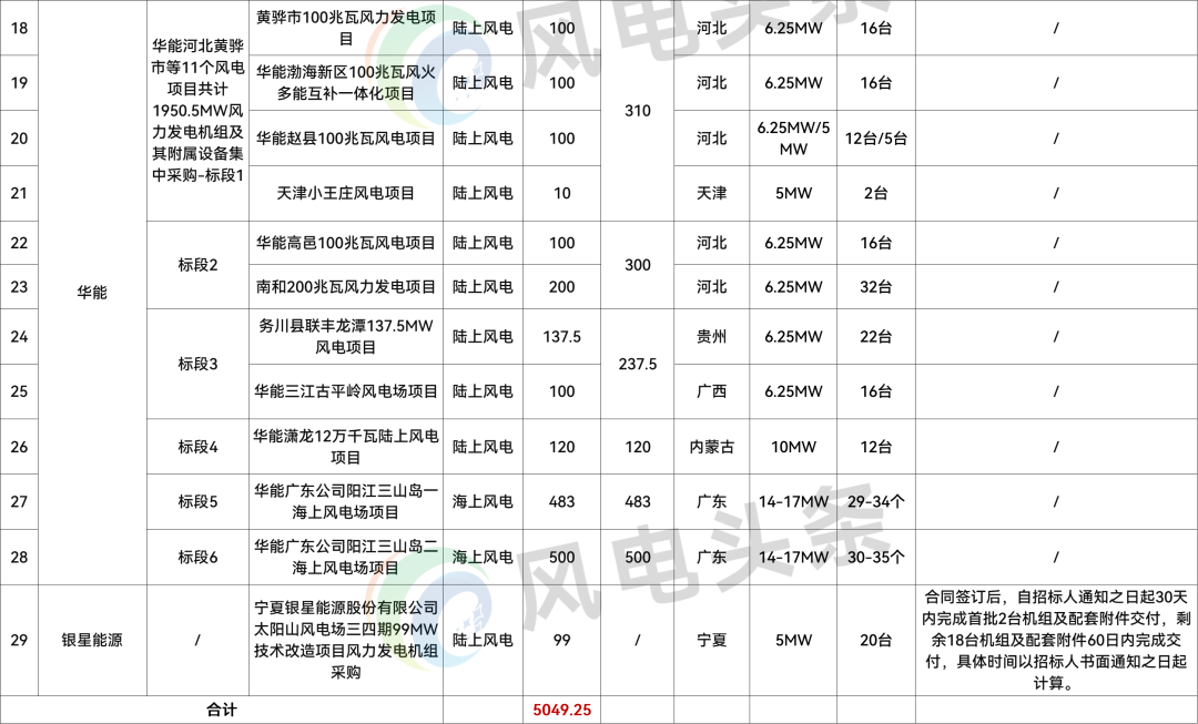 华能河北黄骅市等11个风电项目共计1950.5MW风力发电机组及其附属设备集中采购分为6个标段、11个风电项目,项目规模合计1950.5MW。