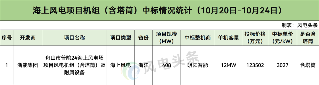 海上风电:含塔筒中标单价3027元/kW。