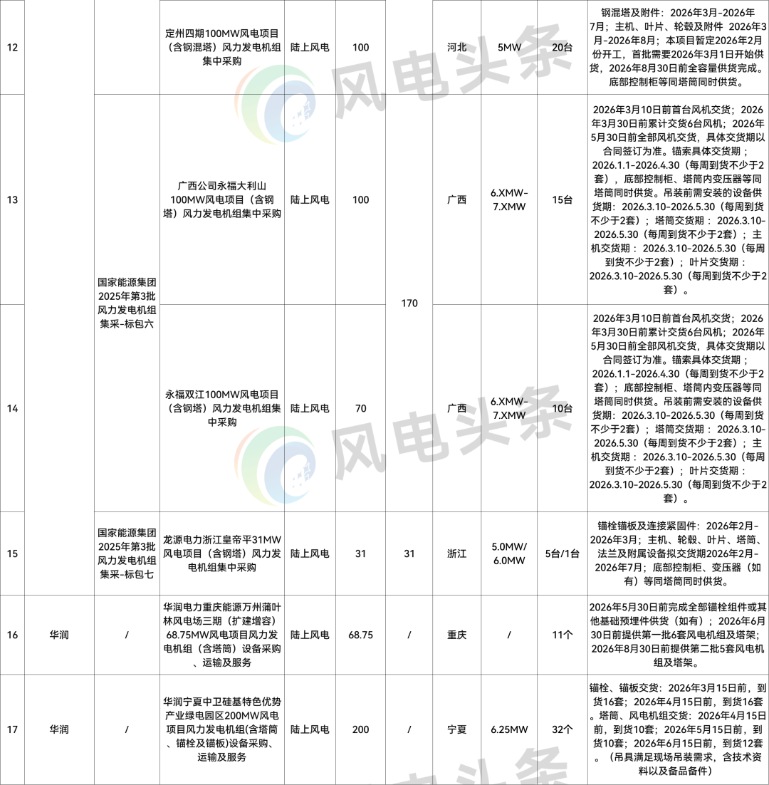 标包六:广西永福双江100MW风电项目位于广西壮族自治区东北部,规划装机容量为70MW,拟安装10台单机容量为6.XMW-7.XMW的风力发电机组(接受混排),轮毂高度120m~130m(包含120m和130m),拟新建1座220kV升压站,新建1回220kV架空联络线接至永福电厂220kV侧,同步配置20%/2h的储能系统或购买储能服务。交货期:2026年3月10日前首台风机交货;2026年3月30日前累计交货6台风机;2026年5月30日前全部风机交货,具体交货期以合同签订为准。锚索具体交货期 ;2026.1.1-2026.4.30(每周到货不少于2套);底部控制柜、塔筒内变压器等同塔筒同时供货。吊装前需安装的设备供货期:2026.3.10-2026.5.30(每周到货不少于2套);塔筒交货期 :2026.3.10-2026.5.30(每周到货不少于2套);主机交货期 :2026.3.10-2026.5.30(每周到货不少于2套);叶片交货期 :2026.3.10-2026.5.30(每周到货不少于2套)。
