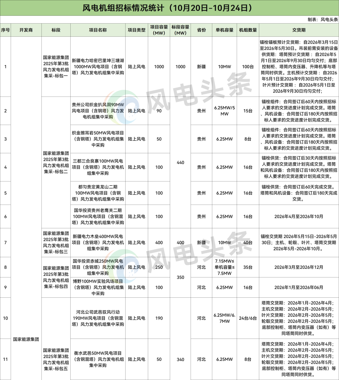 根据招标公告,国家能源集团2025年第3批风力发电机组集采公开招标项目共7个标包、15个项目,规模合计2731MW,单机容量5MW-10MW。