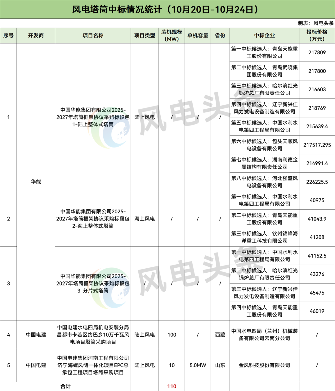 据风电头条统计,本周有5个风电项目塔筒采购开标,规模为110MW,开发商为华能、中国电建。