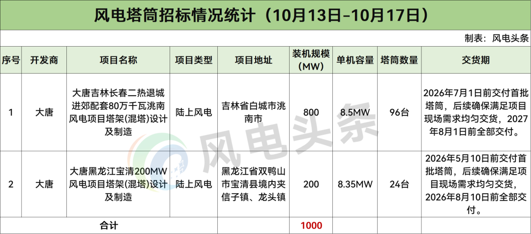 根据招标公告,中广核新能源广东上川岛(大代小)238MW陆上风电项目位于广东省江门市台山市川岛境内,本工程保护性拆除100台原风力发电机组, 新建与投标机型匹配数量的投标机型风机机组,工程核准容量为238MW,机型要求:32台,单机容量7500kW及以上。交货日期及工期:风电机组设备:预计在2026年4月完成交货。塔筒:预计在2026年3月完成交货。吊装:本项目要求风电机组安装前的准备(资料、设备、驻地建设、及人员) , 初步拟定于2025年11月15日前完成全部准备工作,于2026年2月10日完成首套风机供货,2026年2月15日开始风机吊装, 并于2026年6月30日完成全部风机安装,总日历天228天。拆除:本项目初步拟定于2025年11月15日完成全部准备工作,于11月17日开始准备风机设备保护性拆除,2026年3月1日完成全部100台风机拆除,总日历天107天。