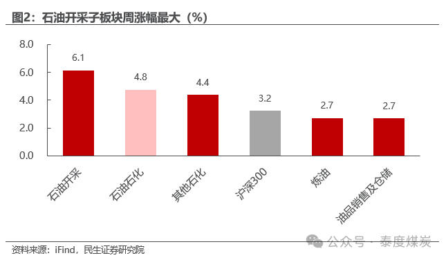 截至10月24日,本周沪深300上涨3.2%,中信石油石化板块上涨4.8%。各子板块中,石油开采子板块周涨幅最大,为6.1%;油品销售及仓储子板块周涨幅最小,为2.7%。