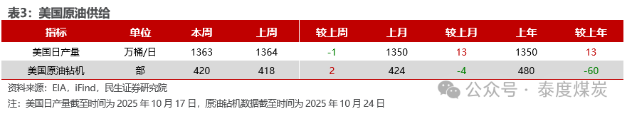 美元指数上升;布油价格上涨;东北亚LNG到岸价格上涨。截至10月24日,美元指数收于98.94,周环比+0.39个百分点。1)原油方面,截至10月24日,布伦特原油期货结算价为65.94美元/桶,周环比+7.59%;WTI期货结算价为61.50美元/桶,周环比+6.88%。2)天然气方面,截至10月24日,NYMEX天然气期货收盘价为3.34美元/百万英热单位,周环比+11.23%;截至10月23日,东北亚LNG到岸价格为11.40美元/百万英热,周环比+2.45%。