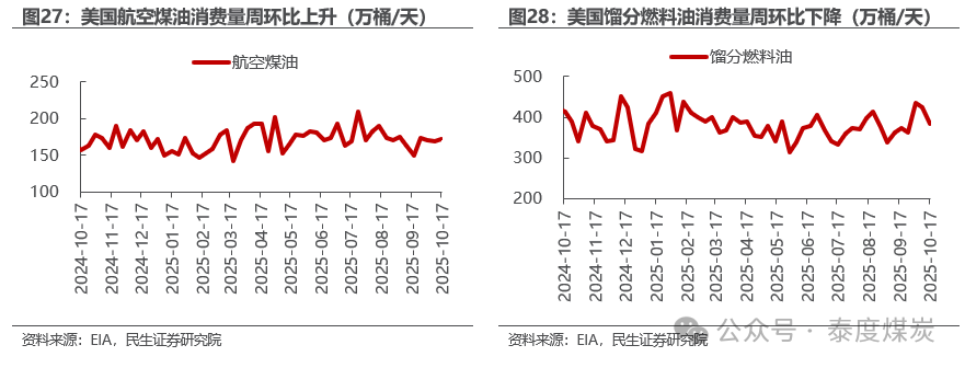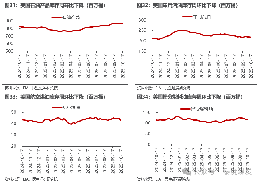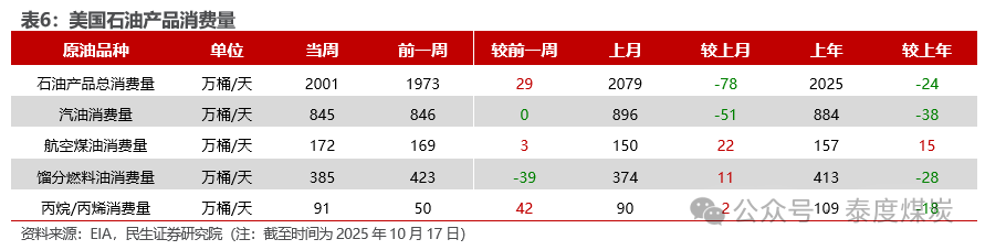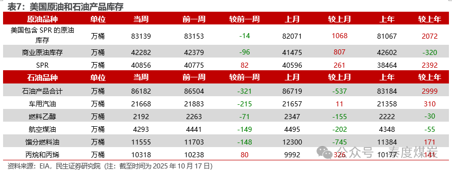 美国原油库存下降,汽油库存下降。截至10月17日,1)原油方面,美国战略原油储备40856万桶,周环比+82万桶;商业原油库存42282万桶,周环比-96万桶。2)成品油方面,车用汽油/航空煤油/馏分燃料油库存分别为21668/4293/11555万桶,周环比-215/-149/-148万桶。
