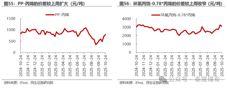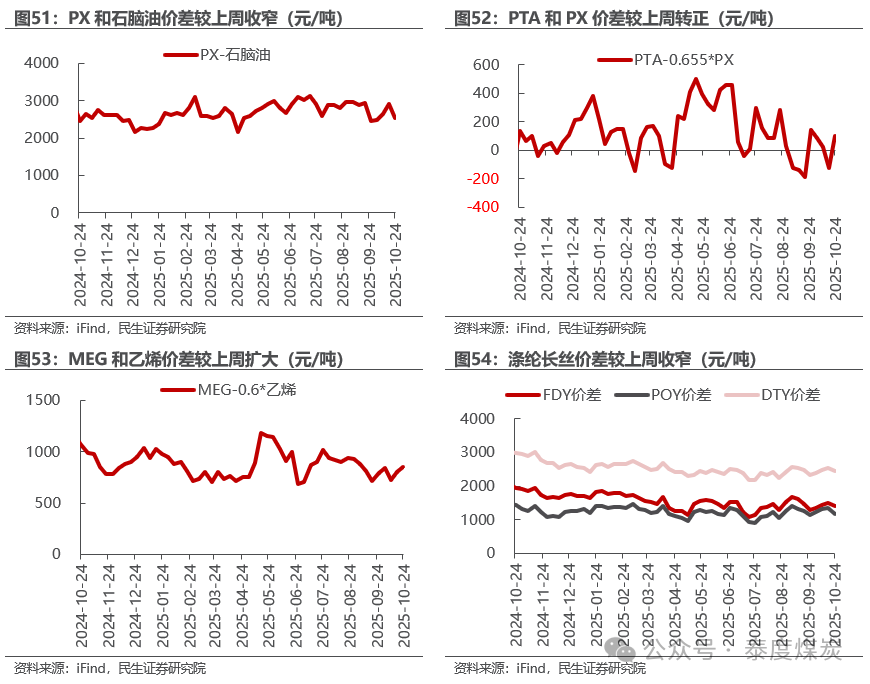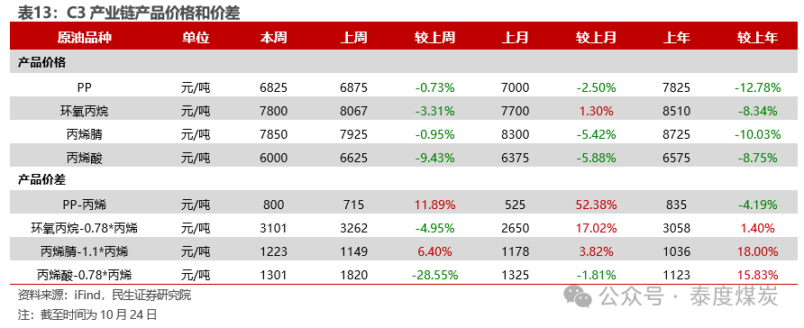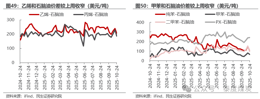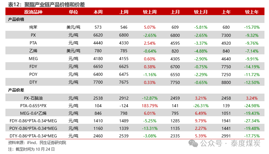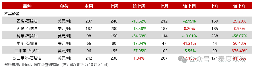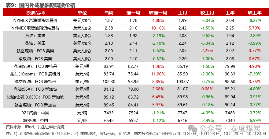 汽油价差收窄,烯烃价差收窄。截至10月24日,1)炼油板块,NYMEX汽油和取暖油期货结算价为1.87/2.38美元/加仑,周环比变化+4.88%/+10.16%,和WTI期货结算价差为16.98/38.43美元/桶,周环比变化-1.79%/+15.84%。2)化工板块,乙烯/丙烯/甲苯和石脑油价差分别为207/187/66美元/吨,较上周变化-13.62%/-18.58%/-17.04%;FDY/POY/DTY价差为1410/1160/2460元/吨,较上周变化-5.25%/-13.31%/-3.08%。