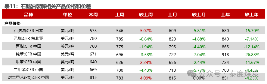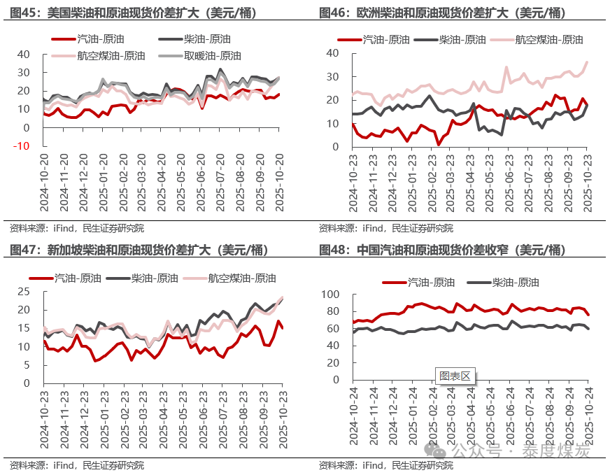 据iFind数据,截至2025年10月24日,国内汽柴油现货价格为7433、6548元/吨,周环比变化-1.21%、-0.12%;和布伦特原油现货价差为76.43、59.48美元/桶,周环比变化-7.64%、-7.39%。