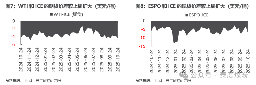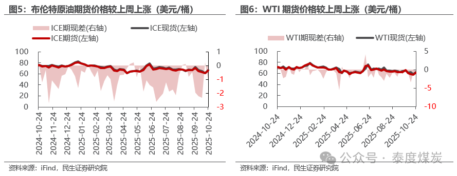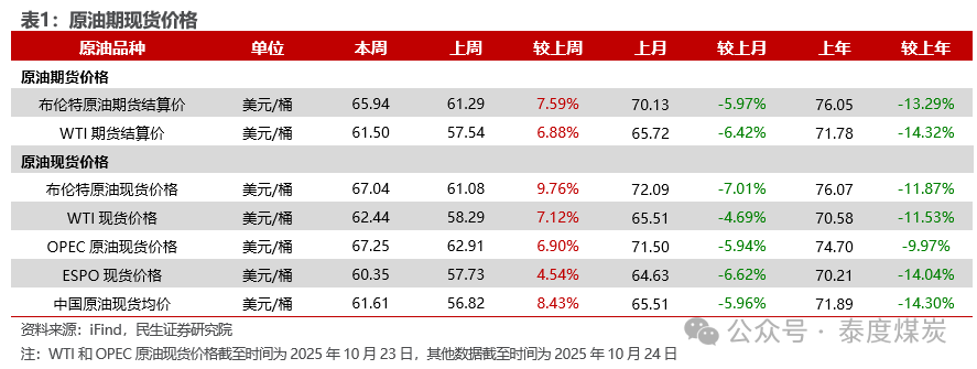 据iFind数据,截至2025年10月24日,布伦特原油期货结算价为65.94美元/桶,较上周上涨7.59%;WTI期货结算价61.50美元/桶,较上周上涨6.88%。