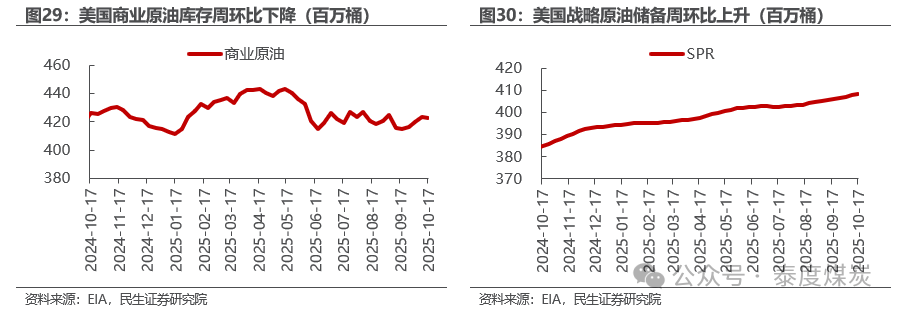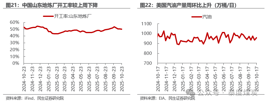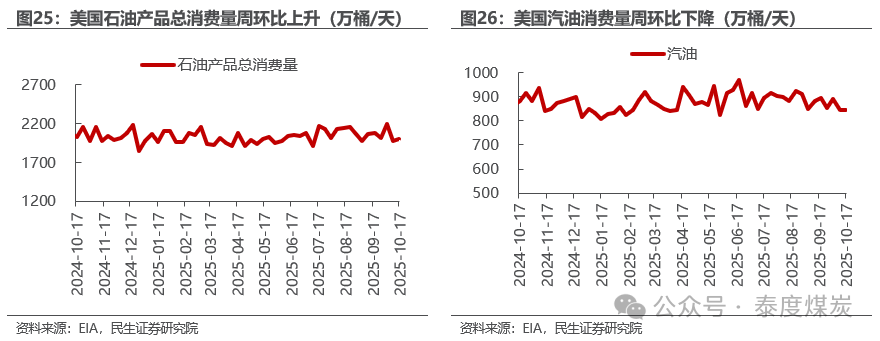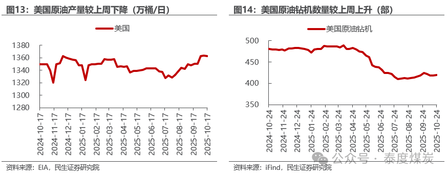 美制裁俄两大石油公司,油价大幅反弹。继特朗普10月21日称推迟与普京的布达佩斯会晤后,美国财政部10月22日的一份声明表示,将制裁俄罗斯国有石油巨头Rosneft和卢克石油公司,且由这两家公司直接或间接拥有50%或以上股权的实体均被冻结,两家公司的原油出口量接近俄原油出口总量的近一半,今年上半年约为220万桶/日。同时,据路透社2025年10月22日消息,接收俄罗斯石油的主要国家之一——印度和美国正接近达成一项双边贸易协定,该协议旨在大幅降低印度对美出口关税,从当前的50%(包括25%的对等关税和25%的购俄石油惩罚性关税)降至15%-16%。从美印双方态度来看,特朗普强调,印度将逐步减少从俄罗斯购买石油,连续第二周声称他直接与印度总理莫迪就此事进行了交谈;印度炼油厂高管也表示,在美国此次制裁后,俄罗斯流向印度主要加工商的石油供应预计将降至接近零的水平。总体来看,一方面,此次美对俄制裁力度较大,对俄的理论出口量影响接近50%;另一方面,美印两方的态度加大了市场对此次制裁导致原油供给收缩的担忧,我们预计,本次油价上涨仅部分定价制裁的影响,后续地缘局势和制裁影响仍需持续跟踪。