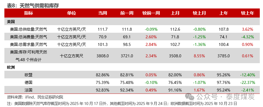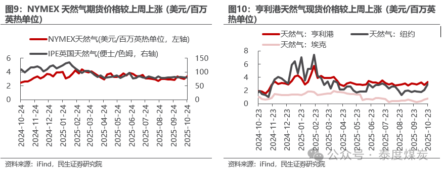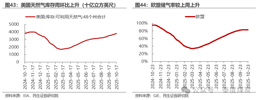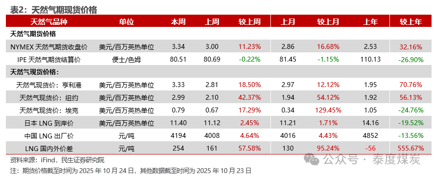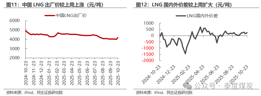 截至2025年10月24日,NYMEX天然气期货收盘价为3.34美元/百万英热单位,较上周上涨11.23%;截至10月24日,东北亚LNG到岸价格11.40美元/百万英热单位,较上周上涨2.45%;中国LNG出厂价为4194元/吨,较上周上涨4.64%。