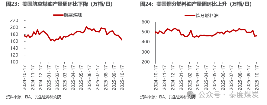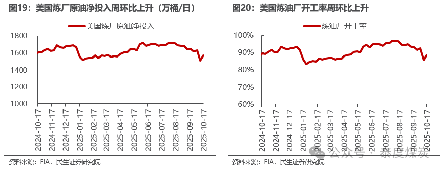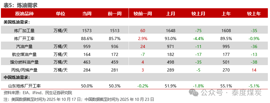 美国原油产量下降,炼油厂日加工量上升。截至10月17日,1)原油方面,美国原油产量1363万桶/日,周环比-1万桶/日。2)成品油方面,美国炼油厂日加工量为1573万桶/日,周环比+60万桶/日;炼厂开工率88.6%,周环比+2.9pct;汽油/航空煤油/馏分燃料油产量分别为959/164/463万桶/日,周环比+24/-7/+4万桶/日。
