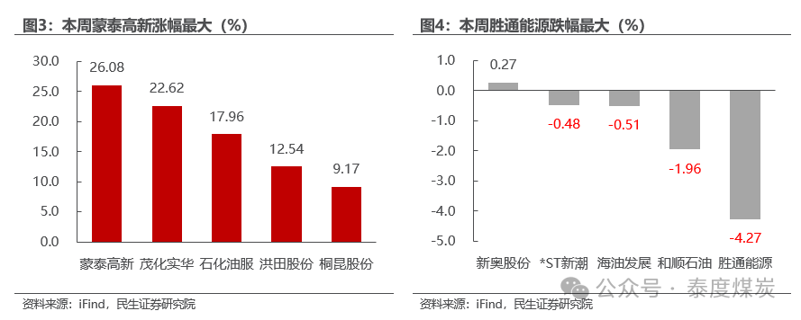 本周蒙泰高新涨幅最大。截至10月24日,石油石化行业中,公司周涨跌幅前5位分别为:蒙泰高新上涨26.08%,茂化实华上涨22.62%,石化油服上涨17.96%,洪田股份(维权)上涨12.54%,桐昆股份上涨9.17%。