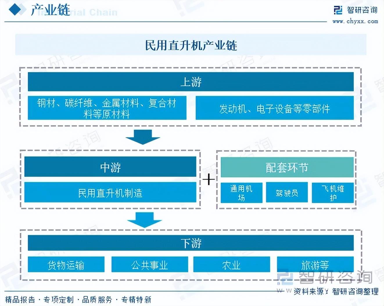 民用直升机产业链条长,涉及环节多。上游为原材料、零部件供应,原材料包括钢材、碳纤维、金属材料、复合材料等,零部件包括发动机、电子设备等。中游为民用直升机制造,系统集成,测试和认证环节。下游为应用领域,民用直升机已广泛应用于货物运输、公共事业、农业、旅游等领域。此外,产业链还包括通用机场、驾驶员、飞机维护等配套环节