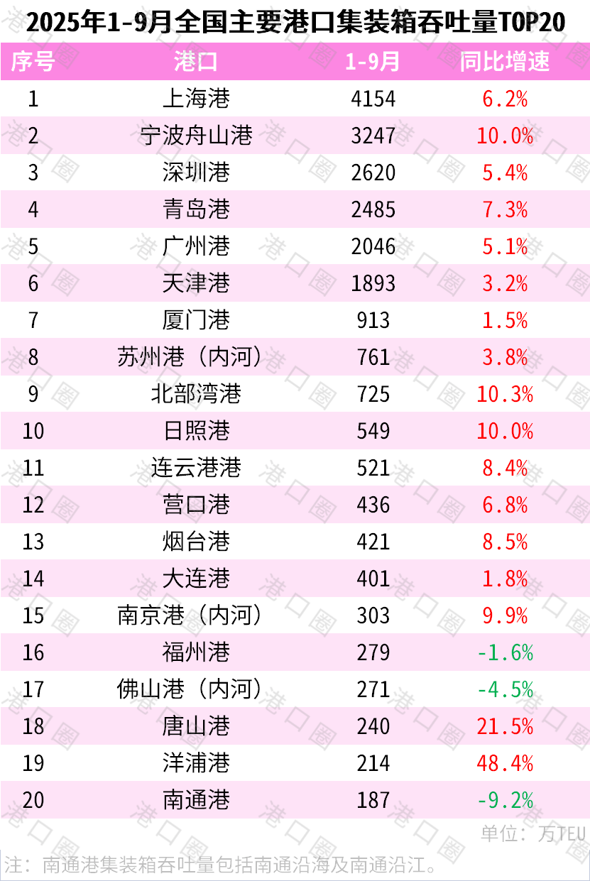 1-9月,全国主要港口集装箱吞吐量前十名为:上海港(第1)、宁波舟山港(第2)、深圳港(第3)、青岛港(第4)、广州港(第5)、天津港(第6)、厦门港(第7)、苏州港(第8)、北部湾港(第9)、日照港(第10)。排名情况与上期相比没有变化。