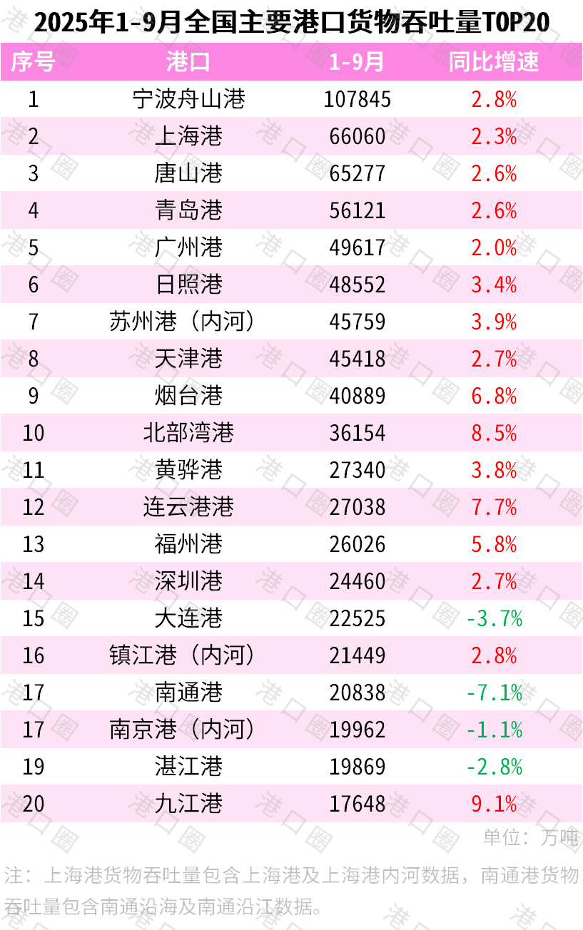 1-9月,全国主要港口货物吞吐量前十名为:宁波舟山港(第1)、上海港(第2)、唐山港(第3)、青岛港(第4)、广州港(第5)、日照港(第6)、苏州港(第7)、天津港(第8)、烟台港(第9)、北部湾港(第10)。