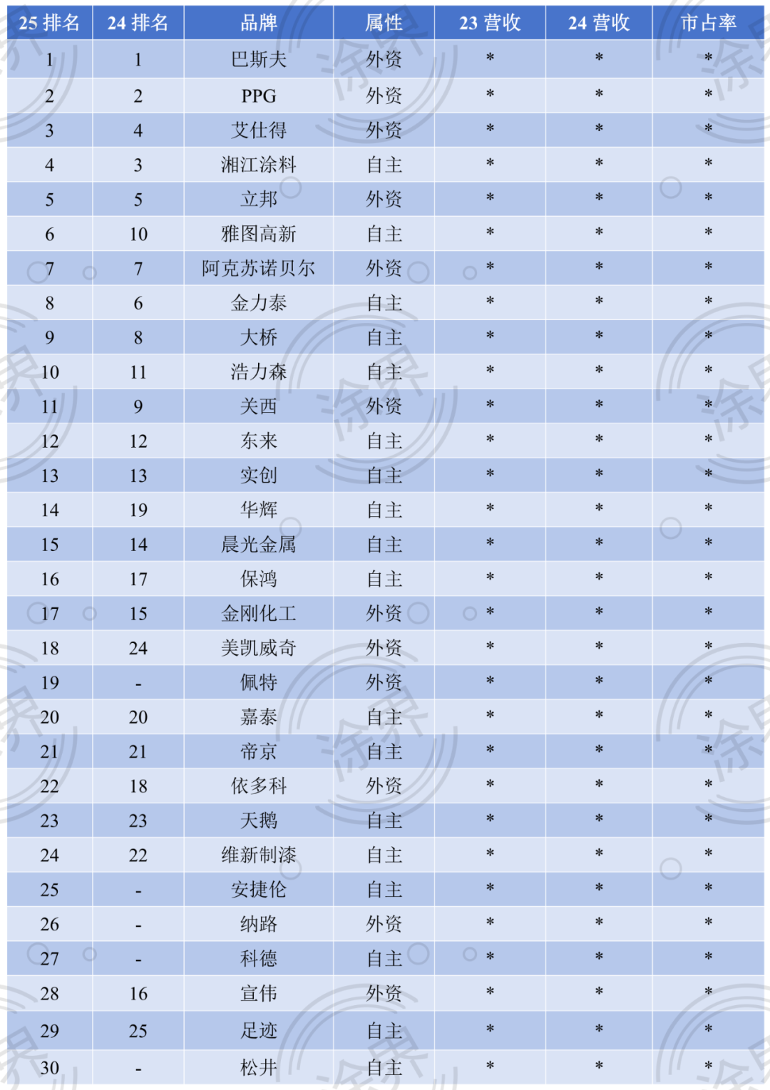 11月13日,国内涂料工业专业财经媒体《涂界》(Coatings Industry)发布“2024中国汽车涂料品牌30强排行榜”,榜单汇聚了国内最具影响力的汽车涂料品牌。榜单主要基于品牌2024年汽车涂料业务销售收入进行排名。这是《涂界》连续第七年发布该榜单,今年榜单入围门槛为XX亿元。