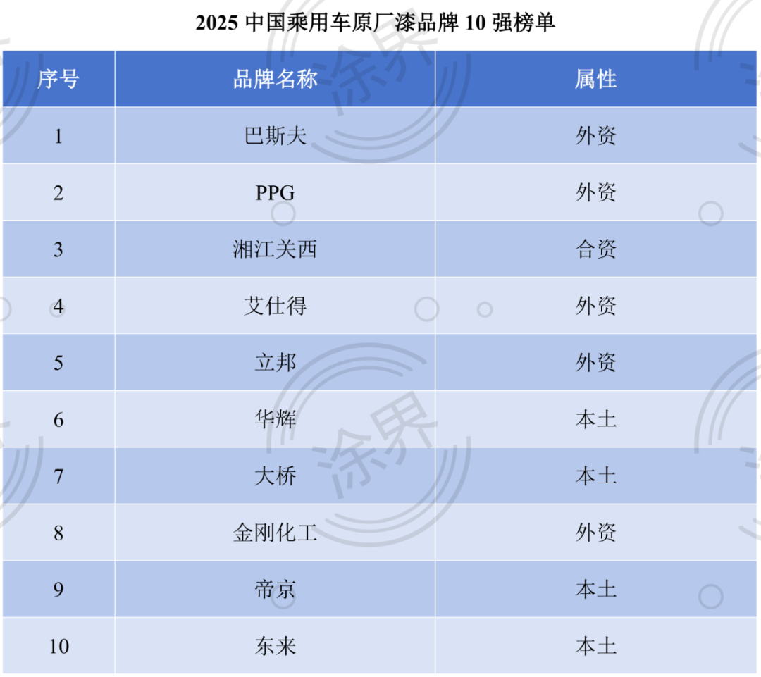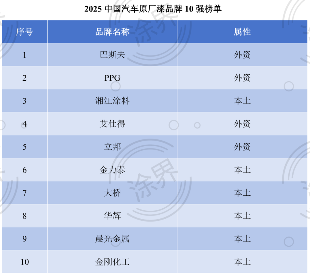 根据“2025中国汽车原厂漆品牌10强榜单”显示,巴斯夫、PPG、湘江涂料、艾仕得、立邦、金力泰、大桥、华辉、晨光金属、金刚化工上榜。其中,湘江涂料旗下汽车涂料业务集中在湘江关西,后者在乘用车OEM涂料领域的产销量处于国内前列;金力泰汽车涂料业务聚焦在商用车涂料领域,是国内最大的商用车涂料品牌。