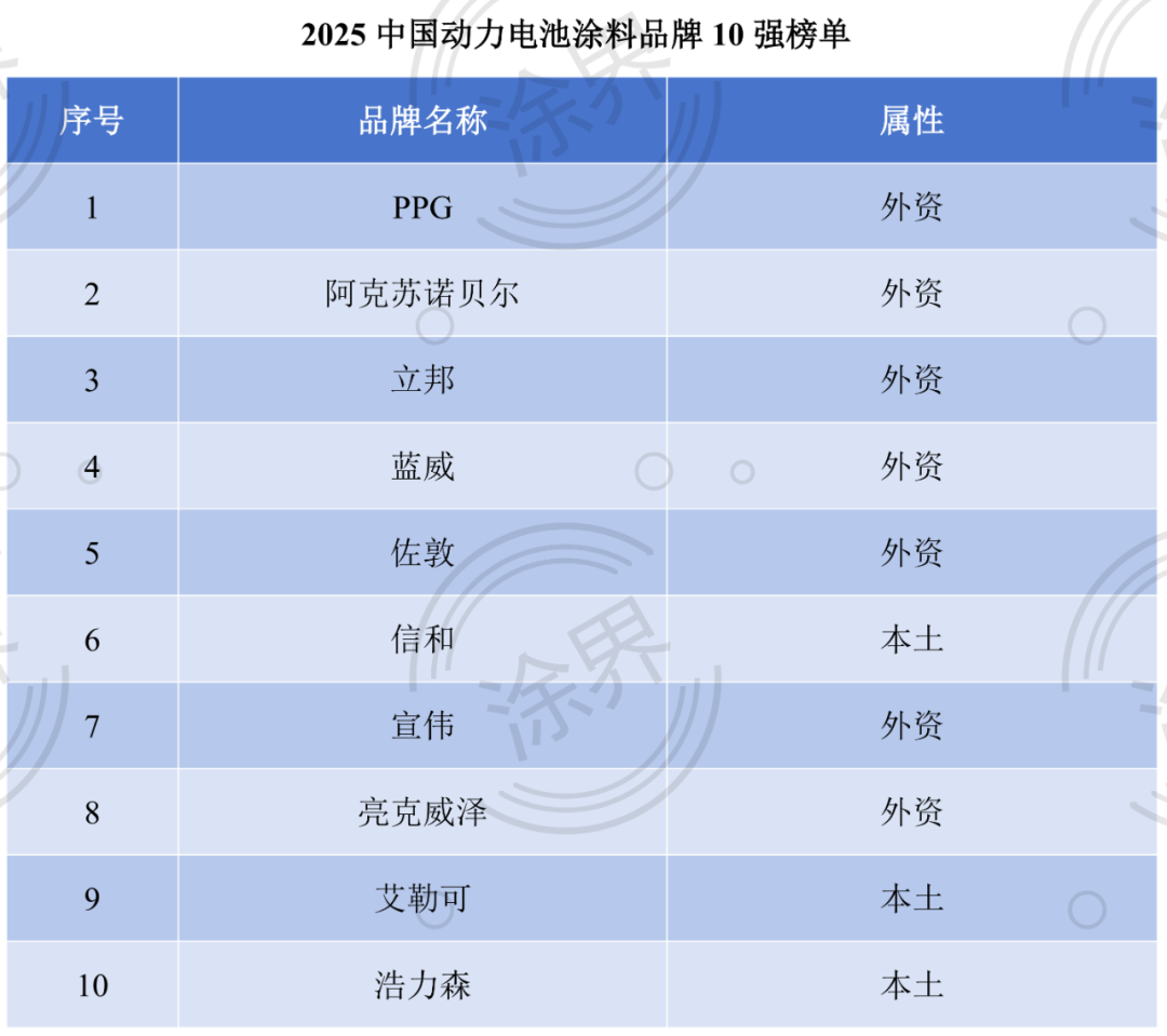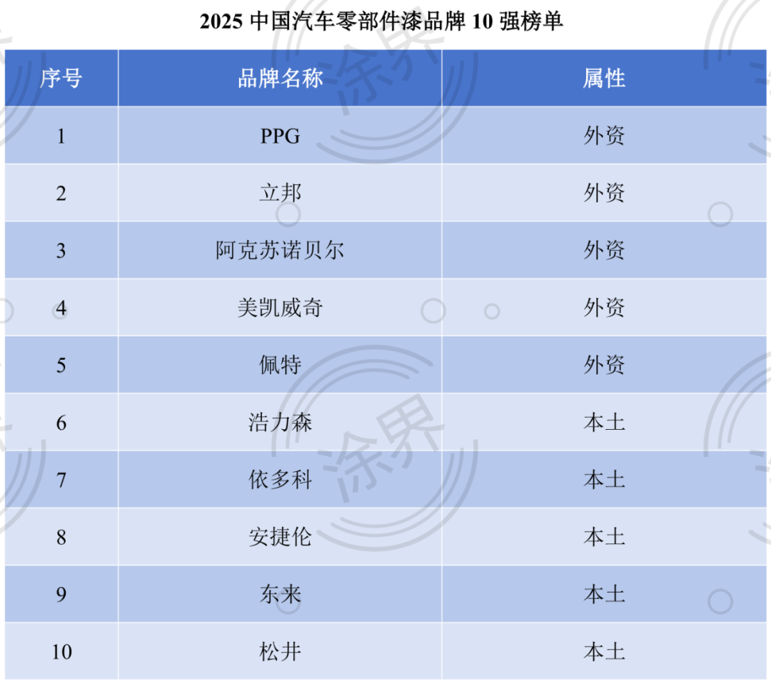 根据“2025中国汽车零部件涂料品牌10强榜单”显示,PPG、立邦、阿克苏诺贝尔、美凯威奇、佩特、浩力森、依多科、安捷伦、东来、松井上榜。根据“2025中国新能源汽车动力电池涂料品牌5强榜单”显示,PPG、阿克苏诺贝尔、立邦、蓝威、佐敦、信和、宣伟、亮克威泽、艾勒可、浩力森上榜。从两个榜单来看,外资品牌在汽车零部件涂料、新能源汽车动力电池涂料市场的体量均比本土品牌大。