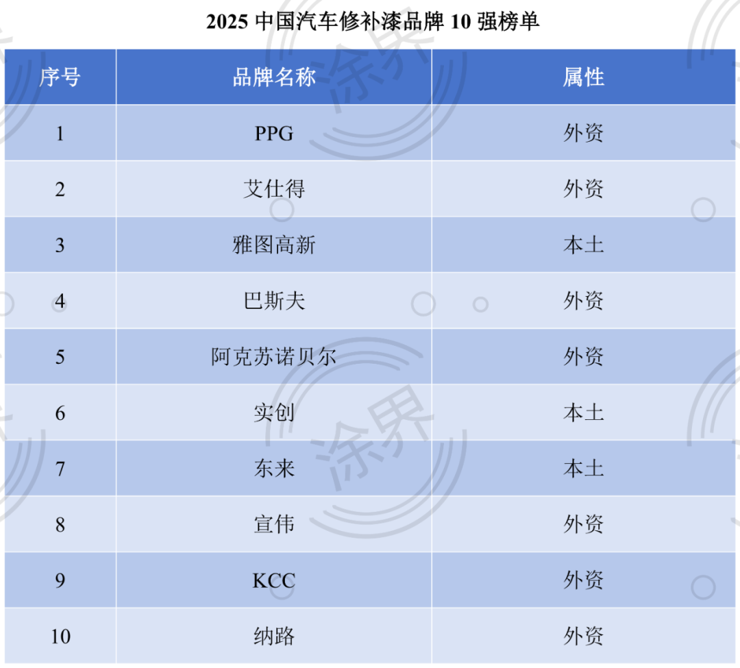 根据“2025中国汽车修补漆品牌10强榜单”显示,PPG、艾仕得、雅图高新、实创、巴斯夫、阿克苏诺贝尔、东来、宣伟、KCC、纳路上榜。目前,国内汽车修补漆市场是本土品牌和外资品牌共存,虽然在市场占有率上,国产品牌超越外资品牌,但是在高端汽车修补漆市场中,主要还是外资品牌,比如PPG、艾仕得、阿克苏诺贝尔、宣伟、巴斯夫等。