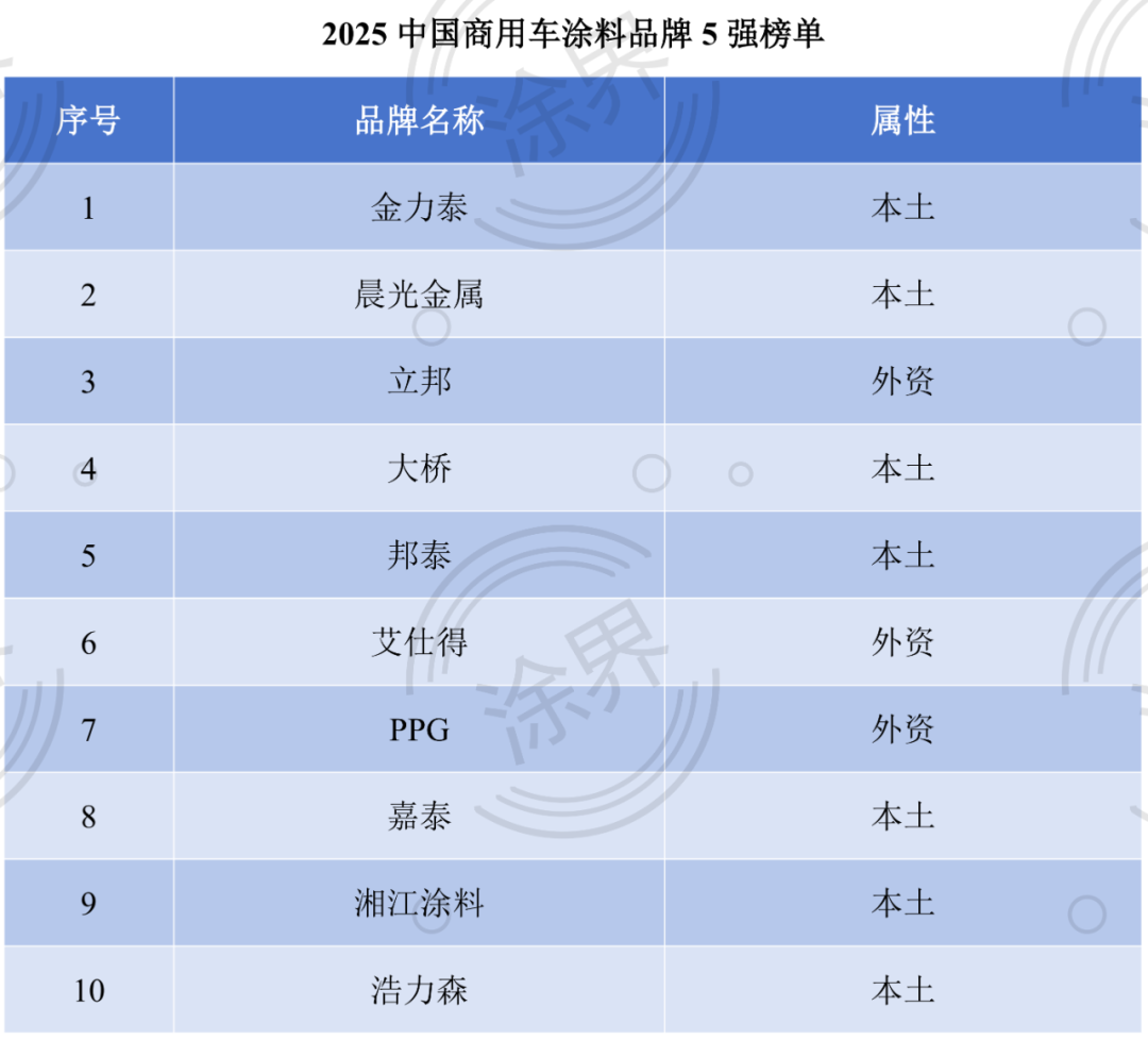 根据“2025中国商用车涂料品牌10强榜单”显示,金力泰、晨光金属、立邦、大桥、邦泰、艾仕得、PPG、嘉泰、湘江涂料、浩力森上榜。其中,金力泰在商用车涂料领域拥有很强的市场竞争力和品牌影响力,以重卡市场为例,目前国内前五强中有4家都是其客户,比如三一、比亚迪,公司商用车涂料产销量连续十多年蝉联国内行业第一,估算全国市占率达到40%左右。