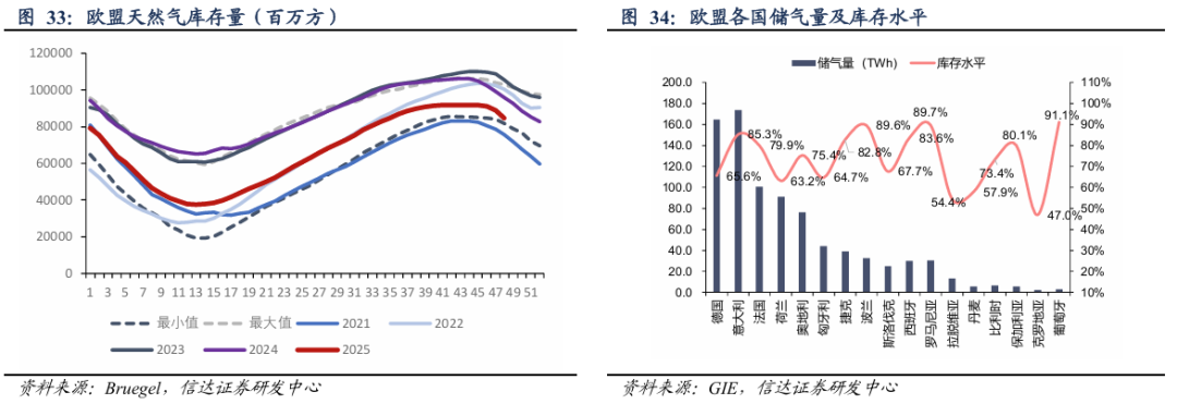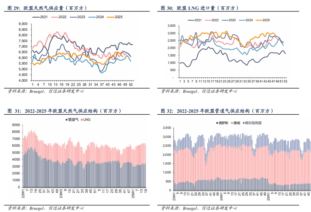 欧盟天然气供需及库存:2025年第48周,欧盟天然气供应量61.1亿方,同比上升4.5%,周环比下降1.9%。其中,LNG供应量为28.8亿方,周环比下降4.6%,占天然气供应量的47.1%;进口管道气32.3亿方,同比下降10.9%,周环比上升0.7%。2025年第48周,欧盟天然气消费量(我们估算)为100.7亿方,周环比上升19.1%,同比上升14.1%;2025年1-48周,欧盟天然气累计消费量(我们估算)为2864.6亿方,同比上升5.2%。