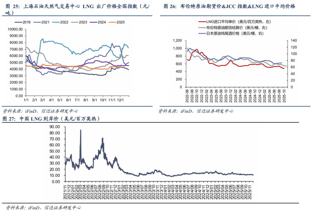 ⚫ 国产LNG价格周环比下跌,进口LNG价格周环比下跌:截至12月4日,上海石油天然气交易中心LNG出厂价格全国指数为4262元/吨(约合3.04元/方),同比下降7.15%,环比下降1.32%;2025年10月,国内LNG进口平均价格为480.51美元/吨(约合2.43元/方),同比下降17.99%,环比下降4.09%。截至12月4日,中国进口LNG到岸价为10.48美元/百万英热(约合2.73元/方),同比下降29.71%,环比下降2.35%。