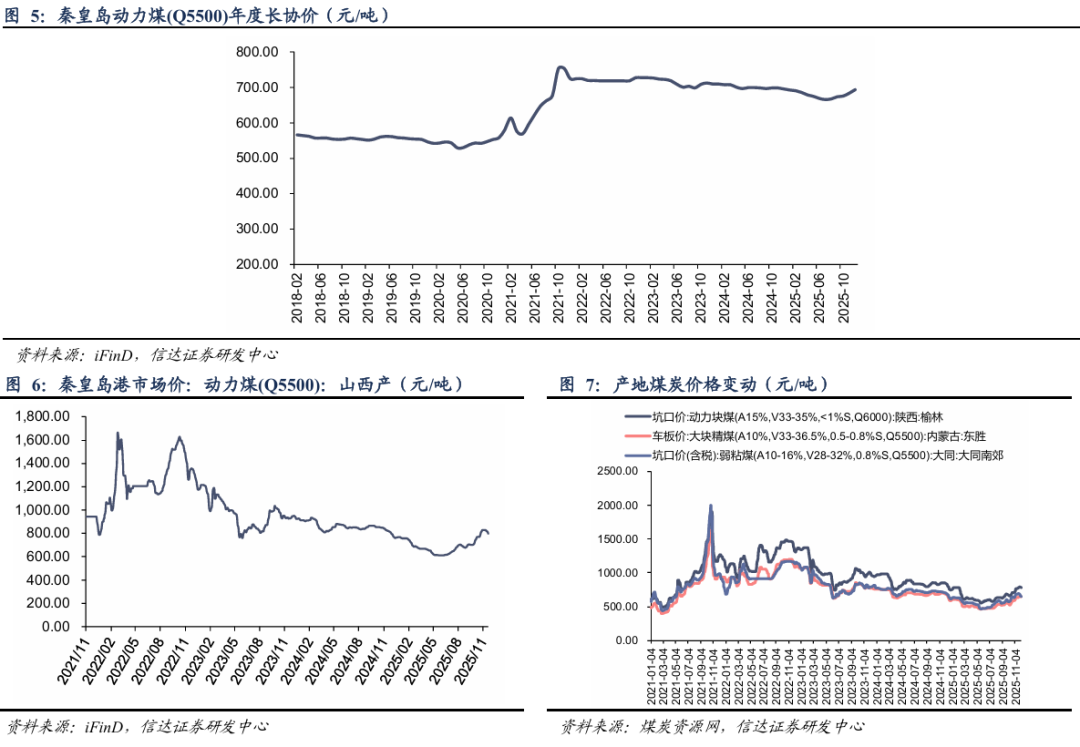 ●长协煤价格:12月,秦皇岛港动力煤(Q5500)年度长协价为694元/吨,月环比上涨10元/吨。