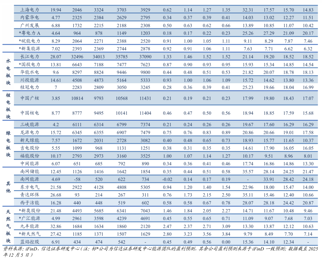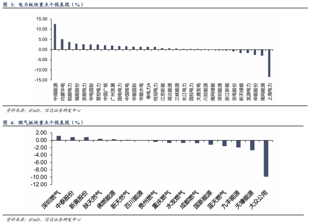 截至12月5日收盘,本周电力板块主要公司涨跌幅前三名分别为:中闽能源(12.62%)、内蒙华电(5.07%)、皖能电力(3.75%),主要公司涨跌幅后三名分别为:上海电力(-13.53%)、南网能源(-2.90%)、申能股份(-2.62%);本周燃气板块主要公司涨跌幅前三名分别为:深圳燃气(1.22%)、中泰股份(0.87%)、新奥股份(0.85%),主要公司涨跌幅后三名分别为:大众公用(-9.84%)、天壕能源(-2.65%)、九丰能源(-1.91%)。