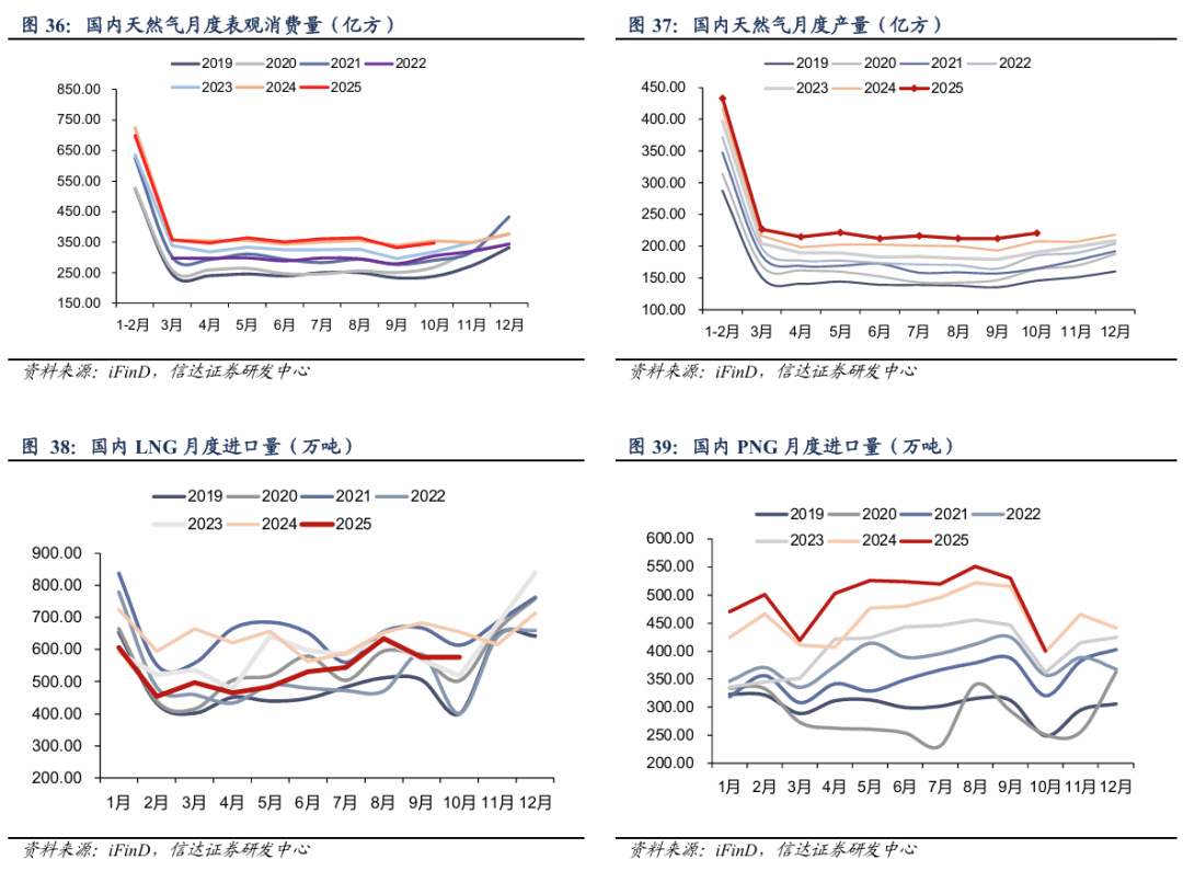 2025年1-10月,国内天然气产量累计为2170.50亿方,累计同比上升6.5%。2025年1-10月,LNG进口量累计为5315.00万吨,累计同比下降16.4%。2025年1-10月,PNG进口量累计为4945.00万吨,累计同比上升7.5%。