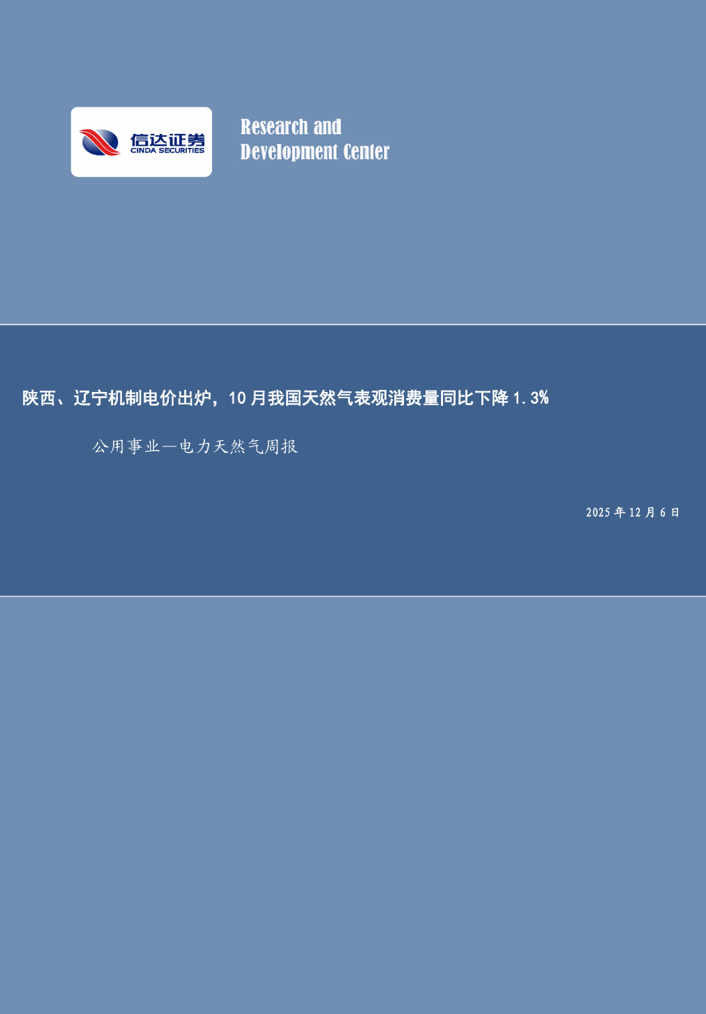 本文源自报告:《电力天然气周报:陕西、辽宁机制电价出炉,10月我国天然气表观消费量同比下降1.3%》