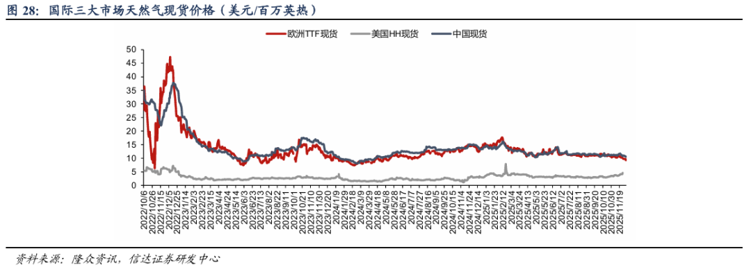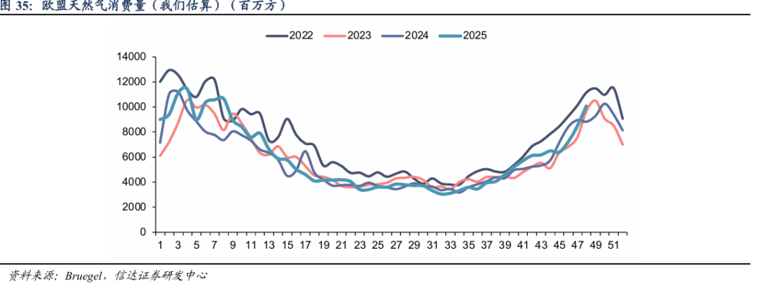 2025年第48周,欧盟天然气消费量(我们估算)为100.7亿方,周环比上升19.1%,同比上升14.1%;2025年1-48周,欧盟天然气累计消费量(我们估算)为2864.6亿方,同比上升5.2%。