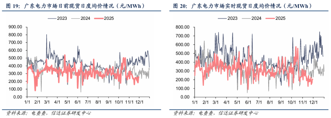 ⚫ 广东日前现货市场:截至11月29日,广东电力日前现货市场的周度均价为219.89元/MWh,周环比下降17.75%,周同比下降15.7%。