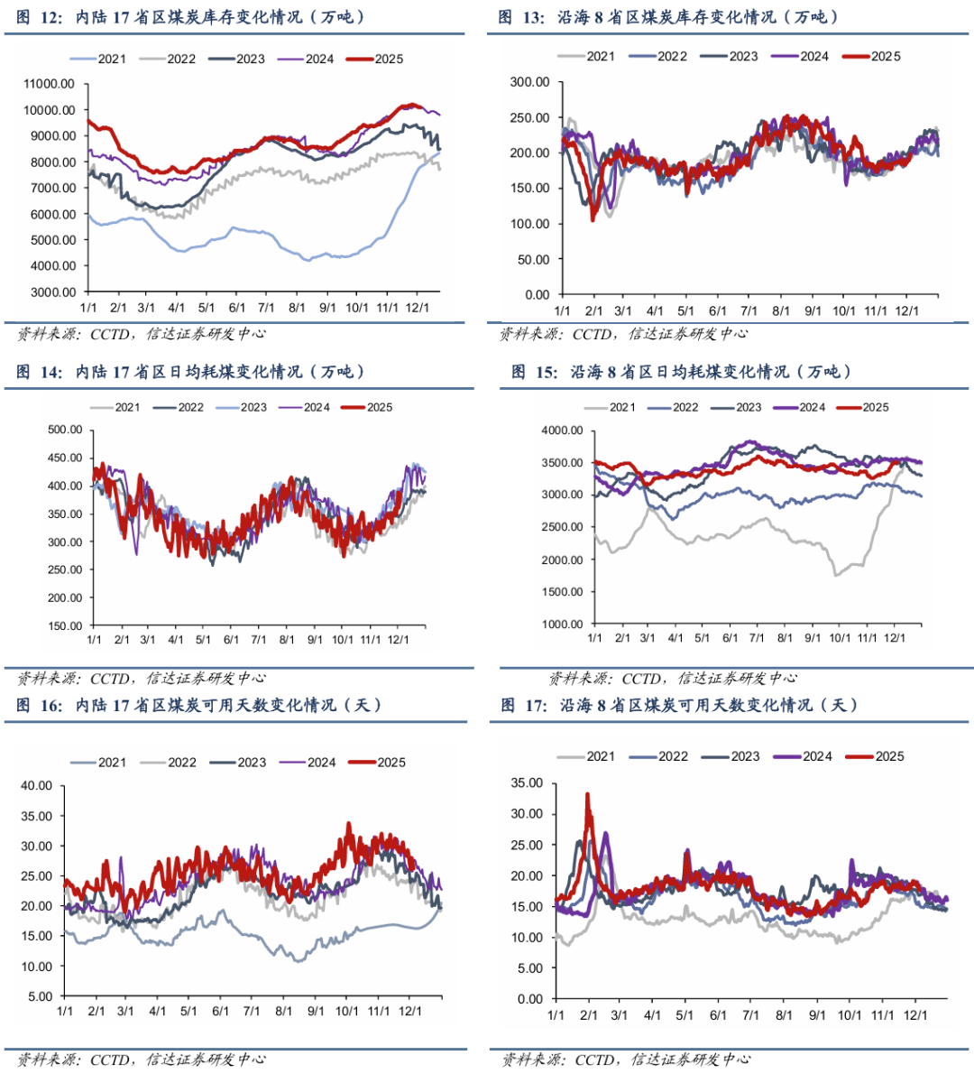 ⚫沿海8省电厂库存、日耗及可用天数:截至12月4日,沿海8省煤炭库存3505.3万吨,较上周增加51.1万吨,周环比上升1.48%;沿海8省电厂日耗为197.7万吨,较上周增加10.7万吨/日,周环比上升5.72%;可用天数为17.7天,较上周下降0.8天。