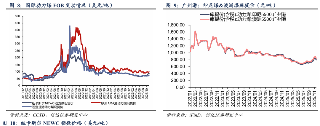 ● 海外动力煤价格:截至12月4日,纽卡斯尔NEWC5500大卡动力煤FOB现货价格85.5美元/吨,周环比下跌2.00美元/吨;ARA6000大卡动力煤现货价97美元/吨,周环比上涨0.70美元/吨;理查兹港动力煤FOB现货价75美元/吨,周环比上涨2.50美元/吨。截至12月5日,纽卡斯尔NEWC指数价格109.1美元/吨,周环比下跌0.2美元/吨。截至12月4日,广州港印尼煤(Q5500)库提价800.2元/吨,周环比下跌32.82元/吨;广州港澳洲煤(Q5500)库提价840.16元/吨,周环比下跌40.80元/吨。