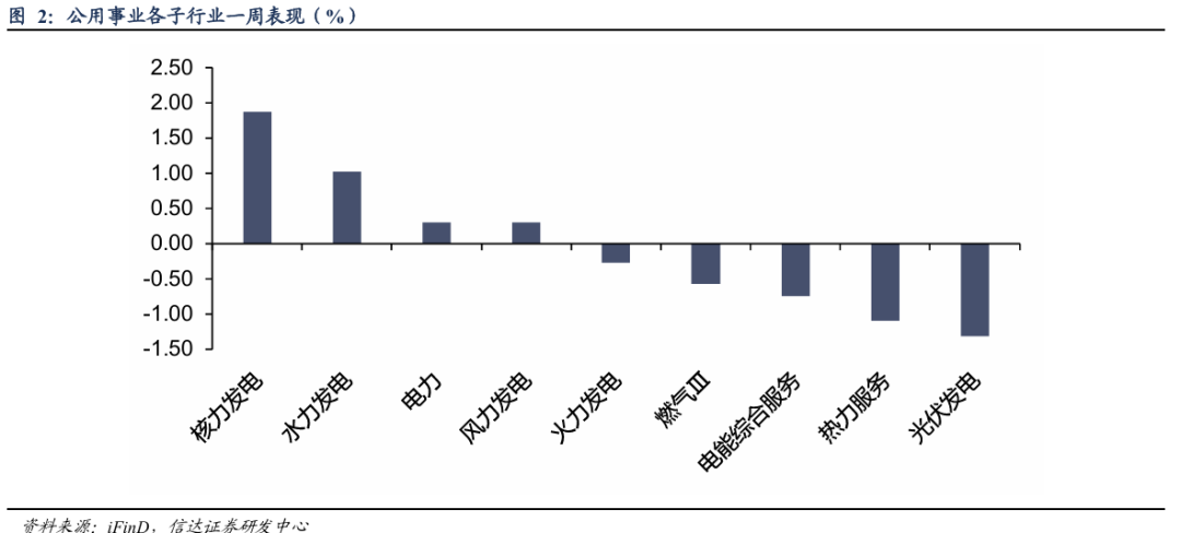 截至12月5日收盘,本周公用事业板块上涨0.1%,表现劣于大盘。其中,电力板块上涨0.30%,燃气板块下跌0.58%。