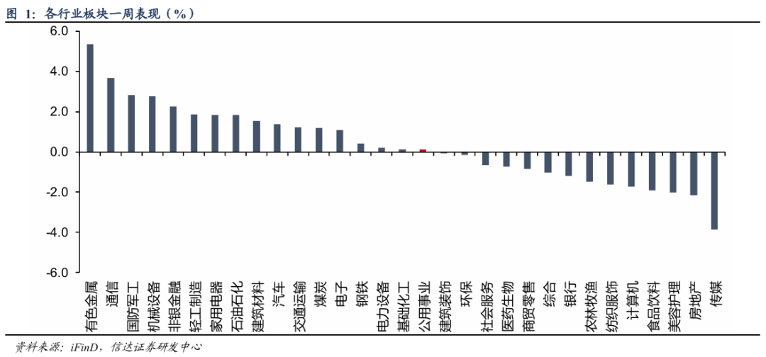 截至12月5日收盘,本周公用事业板块上涨0.1%,表现劣于大盘;沪深300上涨1.3%到4584.54;涨跌幅前三的行业分别是有色金属(5.3%)、通信(3.7%)、国防军工(2.8%),涨跌幅后三的行业分别是传媒(-3.9%)、房地产(-2.2%)、美容护理(-2.0%)。