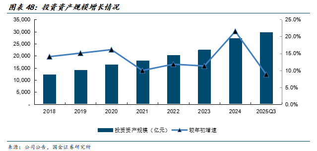 总管理资产规模增长稳健。集团投资资产自2018年1.23万亿元增长至2024年2.73万亿元,年复合增长率14.2%,2025Q3末较上年末继续增长8.8%至2.97万亿元。