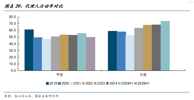 人力规模企稳,队伍质态改善。2025H1太保人力规模企稳,期末保险营销员18.6万人,同比增长1.6%,其中新增人力3.9万人,同比增长19.8%。代理人人均月产能2.06万元,维持高水平,核心人力月人均首年规模保费7.29万元,同比+12.7%,代理人基础夯实活动率高。