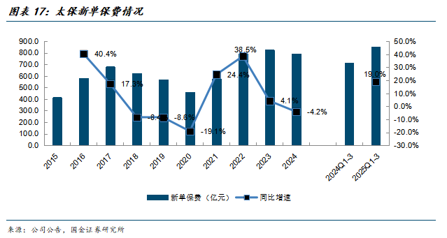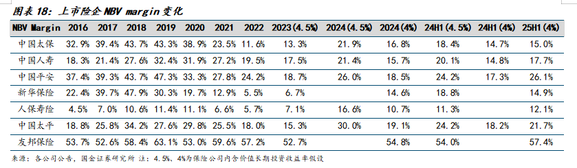 NBV增长主要由Margin改善带来。压降银保趸交规模,2022-2024年太保新单保费复合增速基本为0,NBV增长主要由预定利率下调、报行合一带动价值率提升驱动。