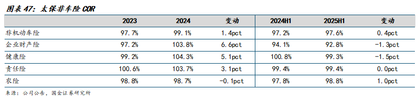 受大灾及个人信用保证保险影响COR同比抬升,“报行合一”政策推进预计将改善。2024、2025H1公司非车险COR分别同比+1.4pct、+0.4pct,分别受大灾及个人信用保证保险赔付增加影响,其中2025H1在剔除个人信保险业务影响后,COR同比-2.3pct至94.8%,盈利基本盘良好。展望后续,预计COR将逐年改善,一是个人信用保证保险影响预计在2026年出清,二是非车险“报行合一”在2026年全面落地,有望带来费用大幅改善。