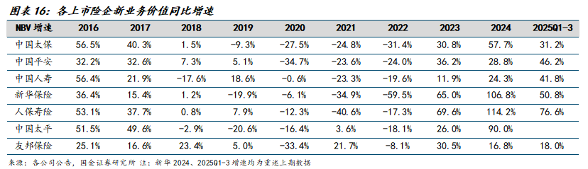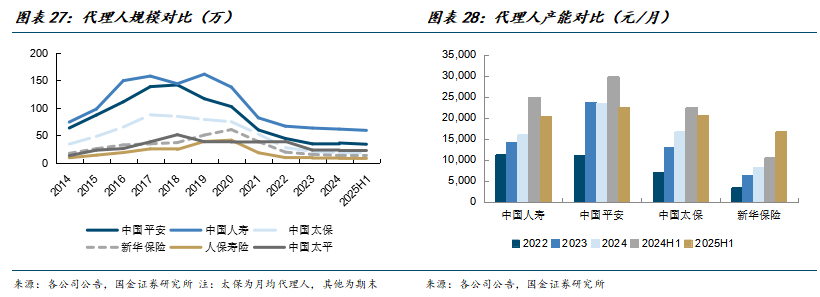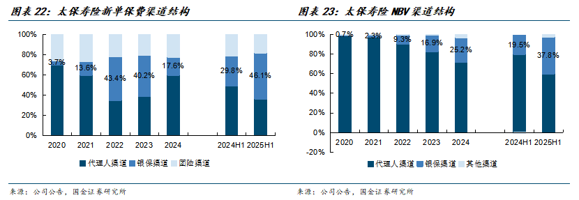 银保渠道报行合一+“1+3”合作网点限制放开,公司全力开拓银保合作网点,驱动银保渠道NBV高增,2020-2024年复合增速147.0%,价值银保成效显现。2025H1NBV同比+156.0%,未重述上期数据口径下,也实现了106.2%的高速增长,仅低于平安、新华。