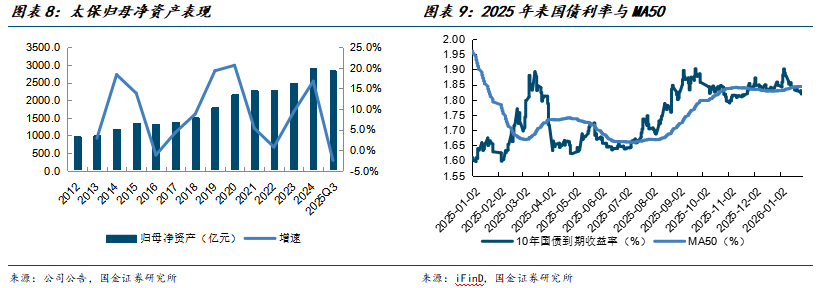 净资产受利率影响下滑,后续将恢复增长。2025Q3太保归母净资产较年初、H1分别-2.5%、+0.8%,主要是公司资产端采用即期利率(2025Q3较年初+17.9%),负债端基于国债50日均线(Q1-3整体-17.3%),导致资产端与负债端公允价值一降一升,净资产有所下滑。长周期来看,公司的资产负债匹配持续向好,当前利率阶段性企稳,叠加保险服务与投资持续正贡献,预计净资产将恢复增长。
