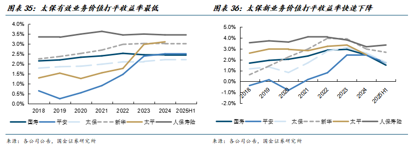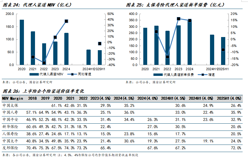 居民储蓄需求旺盛驱动及预定利率下调炒停售下,2023-2024年太保个险渠道NBV恢复较高增长,分别同比+8.8%、+37.1%,其中新单保费分别同比+16.2%、+14.8%,Margin也由23年最低的29.5%回暖至24年的35.2%,实现量价齐升。25H1太保个险渠道NBV同比-2.5%,新单保费在高基数+报行合一影响下同比-8.1%,预定利率下调新业务价值率向好,同比+1.5pct至26.4%。