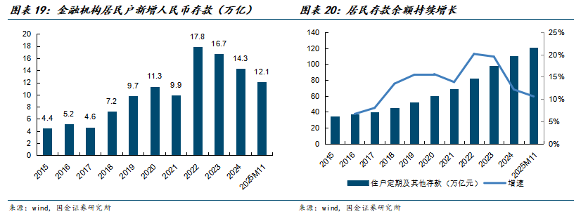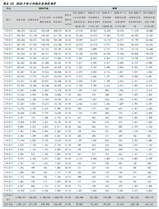 存款搬家已成趋势,到期高峰将至。2020年后居民部门预防性储蓄意愿显著增强,形成了以中长期定期存款为主的巨额蓄水池。2021/2023/2024年的5/3/2年存款将大量于2026年到期,在存款利率下调与中长期存款供给短缺的背景下,将向理财、基金、保险等金融产品转移。